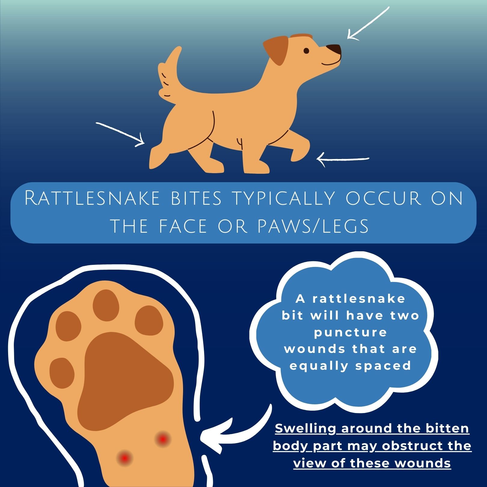 Puncture wounds are the clearest indicator that your dog has been bitten by a rattlesnake. You will see two small puncture wounds that are equally spaced. If you were not aware of the bite as it happened, local swelling may reduce the visibility of the puncture wound.