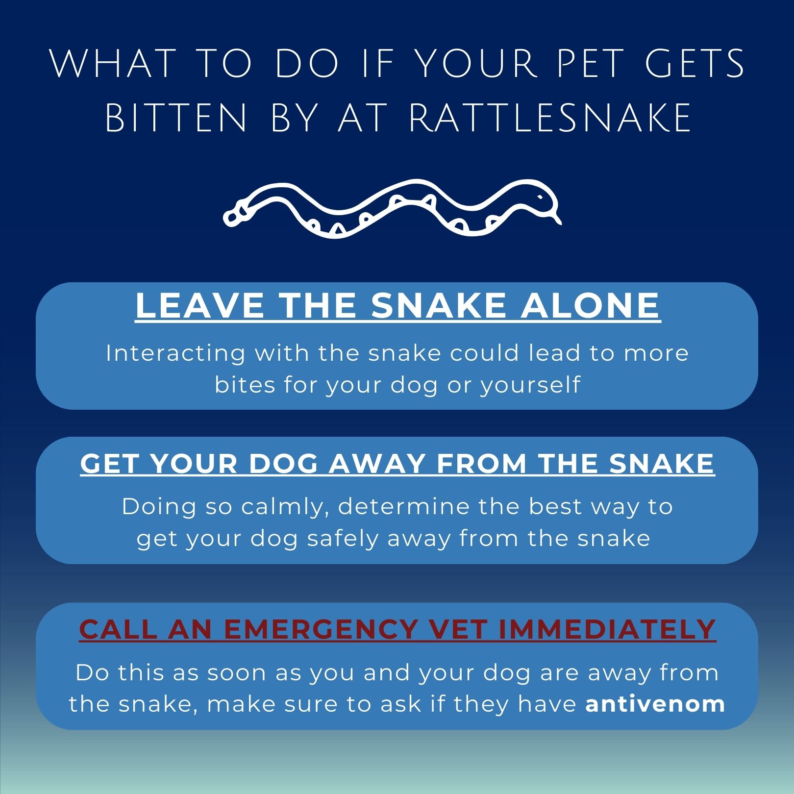 Once you and your dog are safely away from the snake, get your dog in the most comfortable position possible with an effort to keep the bite below their heart. When calling the closest emergency vet, be sure to describe what happened, when it happened, and clarify if they have antivenom at their practice. Rattlesnake bites are not able to be treated without it.